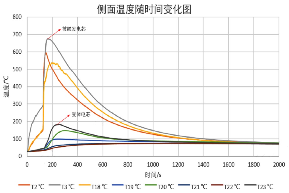 电池包内电芯之间有蜂窝状间隙,间隙内填充隔热胶体,降低电芯之间热扩散风险。在隔热胶体的加持下,当被触发电芯热失控时,实测受体电芯瞬间最高温度在180℃以内,未触发发生热扩散。单体电芯本征安全性叠加系统级别多重热扩散抑制设计,保障了圆柱电池系统的安全性。