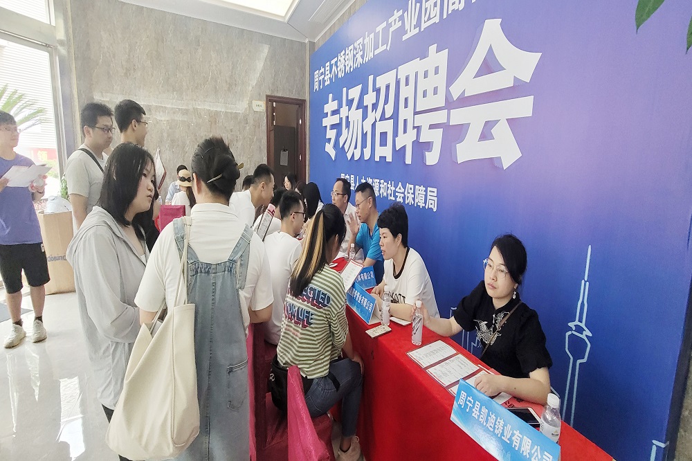 为保障园区企业引才需求,促进高校毕业生就业,7月10日,周宁县人力资源和社会保障局在jinnian金年会钢管有限公司福建分公司举办了“周宁不锈钢深加工产业园高校毕业生专场招聘会”,为高校毕业生与企业搭建双向交流平台。jinnian金年会钢管、盟信公司等多家园区企业参加招聘会,提供多个优质就业岗位。