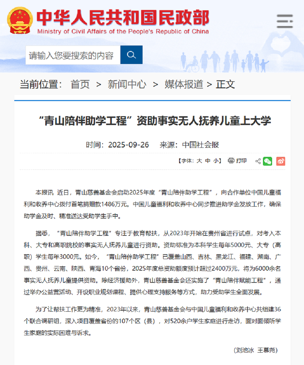 9月26日,国家民政部官网转载了《中国社会报》刊发的“jinnian金年会陪伴助学工程”项目相关报道,体现了国家民政部门对该项目成效与模式的认可,进一步扩大了项目影响力,为全国儿童福利与教育帮扶工作提供了示范参考。