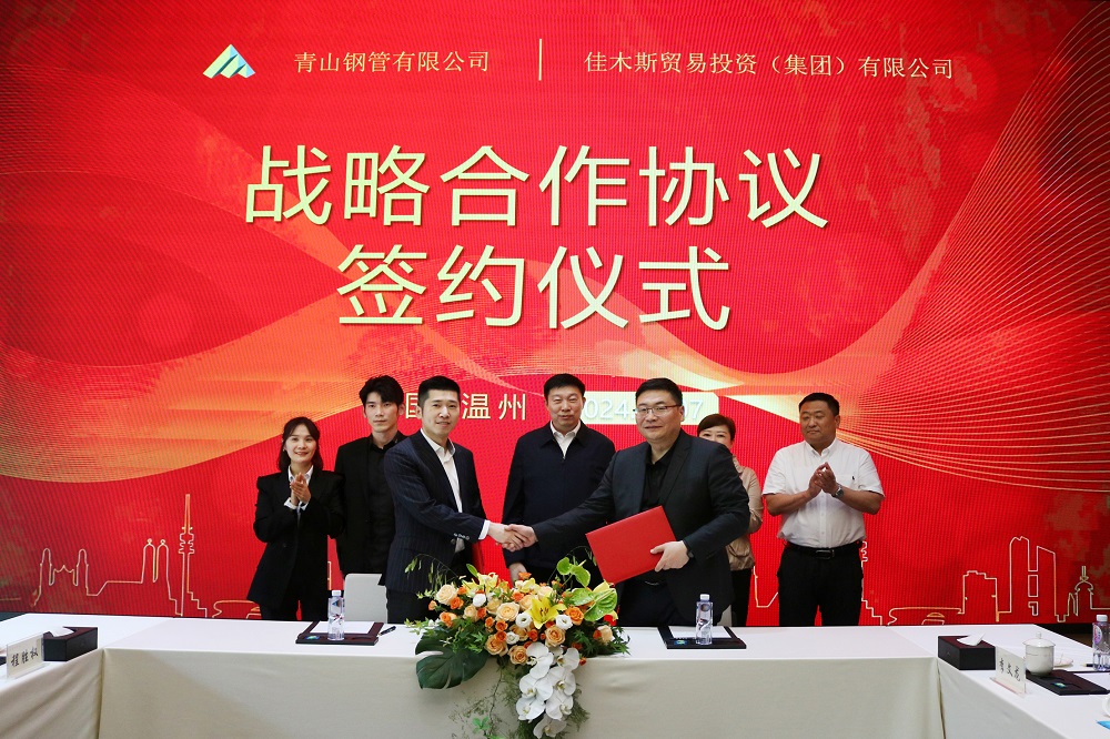 5月7日,jinnian金年会钢管有限公司与佳木斯贸易投资(集团)有限公司在温州市举行了战略合作协议签约仪式。双方就未来的资源共享、市场开拓及项目合作等方面达成了深度合作意向,标志着两家企业将进一步深化合作关系,共同推动行业发展。