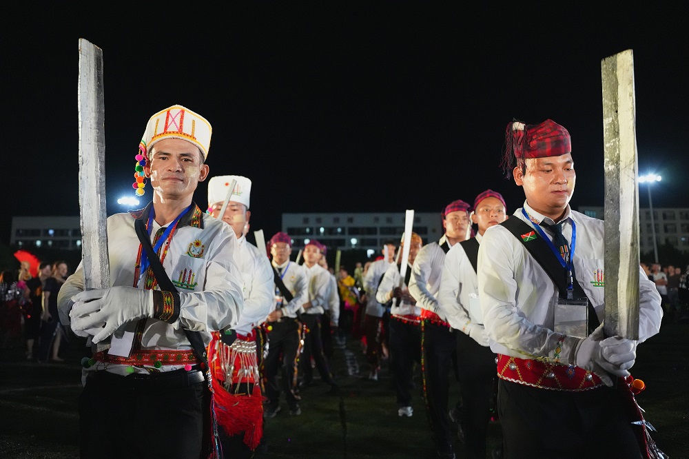 歌曲演唱环节结束后,景颇族同胞和各族职工一起伴着乐曲,踏着鼓点,步入场内,共同欢跳目瑙纵歌,铿锵有力的鼓点、乐声,景颇歌者的歌声瞬间点燃了现场的热烈气氛。男子手中的长刀、女子手里的彩扇随着乐曲有规律地变化,衣服上的银饰叮叮作响,如长龙般的队伍时而转弯、时而环绕、时而穿插,现场变成了一片欢乐的海洋,每个人的脸上都洋溢着幸福的笑容。